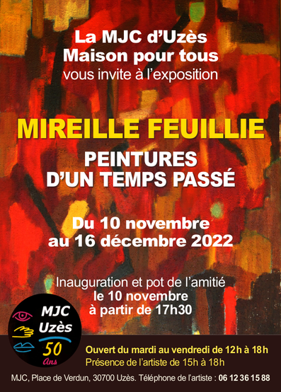 La naissance de la MJC date de 1972, et dès 1979 Mireille a ouvert un atelier d’Arts Plastiques. Et pendant près de 30 ans, dans un esprit de convivialité, elle a permis à de très nombreuses personnes jeunes et adultes de s'exprimer, de développer leur créativité, grâce à des apports théoriques et surtout par le plaisir de la pratique. C'est donc avec grand honneur que nous accueillons cette artiste polyvalente.